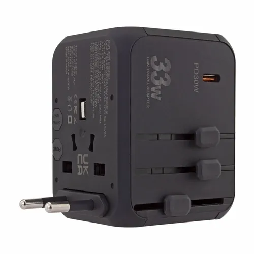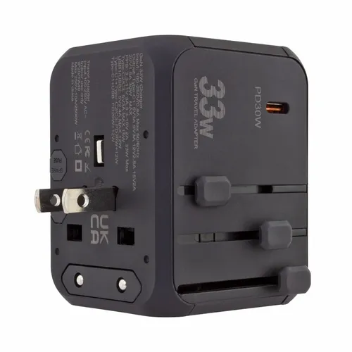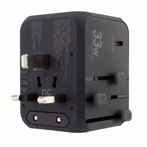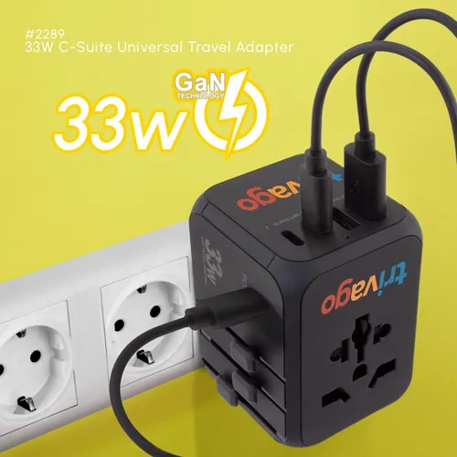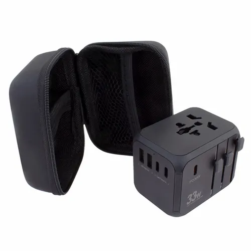 A travel adapter that is perfect for teams that need to travel often for business. Comes with Type-C ports and two USB ports that allow you to charge multiple devices simultaneously. Features: Covers more than 150 countries with US/EU/UK/AUS plugs Built-in safety shutters protect users from the direct touch of the live parts on the socket outlet Only one plug-type can be used at one time by sliding the knob selection, other plug-pins are locked automatically