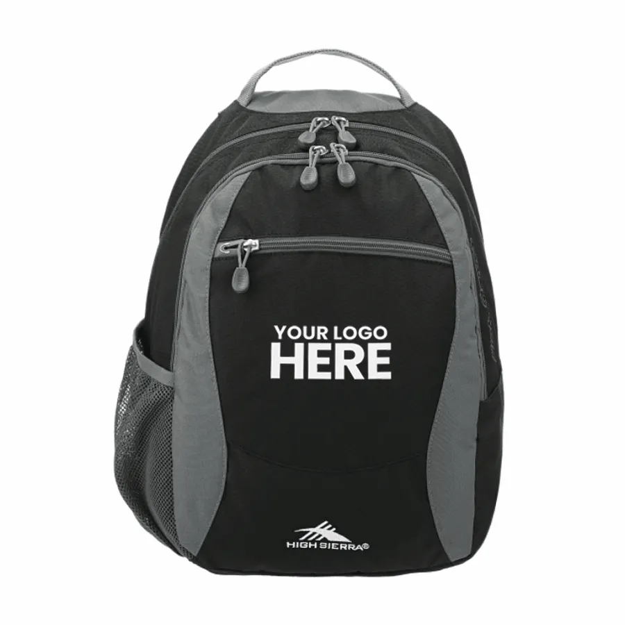 The High Sierra Curve Backpack features a large front load main compartment and an organizer compartment with pen pockets. A front zippered accessory pocket includes a headphone port. Large gusseted side mesh beverage pockets. There is an-shaped padded shoulder straps with a cell phone/media pocket, a padded back panel and a heavy duty webbing grab handle. Signature High Sierra hardware. Includes lifetime warranty.