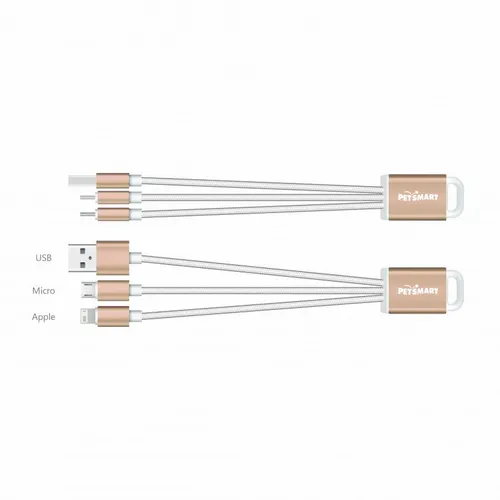 The perfect companion to the stylish tech enthusiast. With the elegant metallic design and durable braided cables this charging cable adds elegance to utility and can be engraved for a subtle refined style or imprinted with color to give your client's logo pop! The cable includes USB, MicroUSB, and 8-pin style tip to cover most Android and other devices.