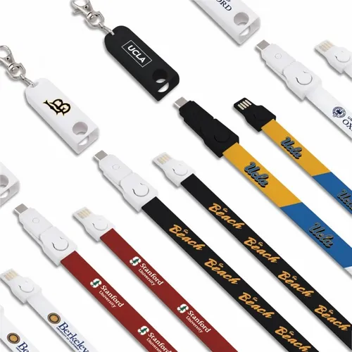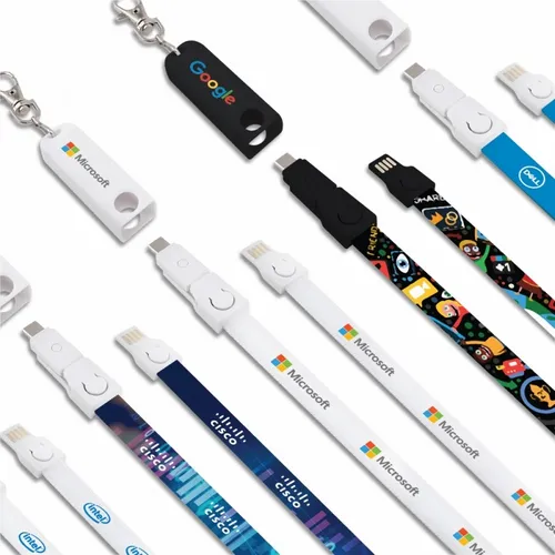 This breakaway lanyard cable charges all Smart Phones with it's Type-C tip and combo tip for 8-pin style and Micro-USB charging. Fashionable and Convenient with nice full-color branding area on the fabric strap. Simply detach the key chain clip and the lanyard to become a 3-foot charging cable. Full-color print available to clearly display a client's logo. NOTE: Badge holder is not included.