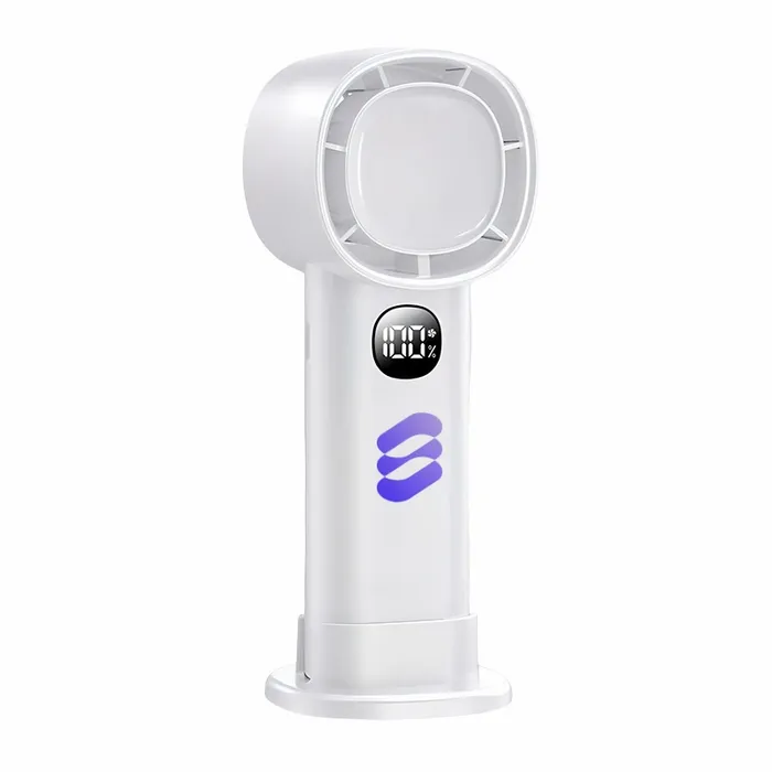 Stay cool anywhere with this Portable Handheld Fan with LED Display & Power Bank. Crafted from durable plastic, this compact fan delivers powerful airflow with 100 adjustable wind speeds, letting you freely switch between gentle and strong settings for ultimate comfort. The built-in 5000mAh battery provides long-lasting performance and recharges quickly through a Type-C fast charging interface. Designed with convenience and style in mind, it features a comfortable 3-inch handle, LED power display, and night light mode — perfect for travel, office, or outdoor use. Available in multiple colors and customizable with your logo, this fan combines function, portability, and personalization in one sleek design.