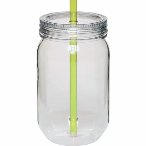 24 oz. Single Wall Plastic Mason Jars. AS Plastic Material. With Screw-on Lid and Straw. Hand Wash Only. Note: Do not microwave