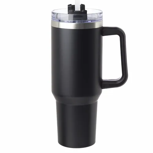 40 oz. Capacity. Slider Transparent Lid with Straw Included. Double Wall Stainless Steel to Hold Temperature. Vacuum Insulated. Easy Grip Handle to Grab-n-Go. Measurement with Lid is 10" H, Straw: 0.25" W x 12" H. Wide Mouth for Easy Cleaning and Pouring Drinks. Keeps Hot for Approximate 6 Hours, Cold for 10 Hours