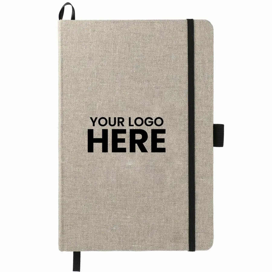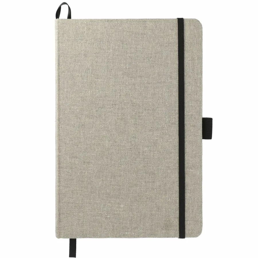 The 5.5 x 8.5 Recycled Cotton Bound Journal is perfect for all of your notetaking needs. Features a hard cover made from recycled cotton. Natural color elastic closure, pen loop and ribbon page marker. 80 sheets of FSC Mix cream lined paper. Back document pocket. FSC label printed inside. Through a partnership with 1% For The Planet, one percent of sales of all EcoSmart products are donated to environmental nonprofits.