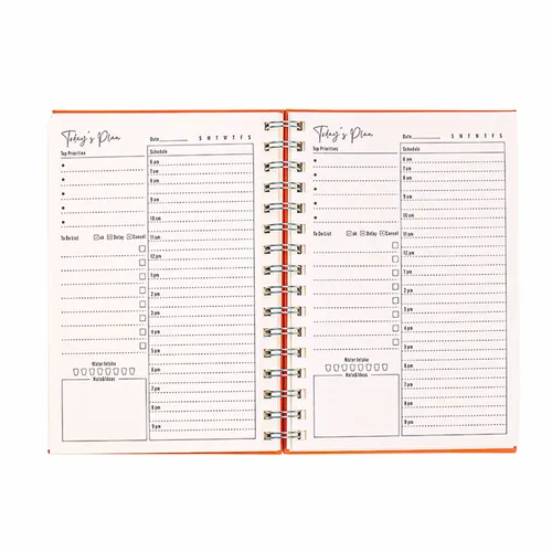 A vibrant, spiral-bound planner with a color-changing PU cover, perfect for daily organization and note-taking.Size: 215 x 150 mmCover: Color-changing PUPages: 80 sheets / 160 pages (100g paper)Colors: Deep Blue, Pink, Orange, YellowWeight: 0.34 kgCustomization: UV printing, foil printing, debossingPrinting Area: 150 mm x 100 mmIdeal for keeping your day organized with style and durable functionality.