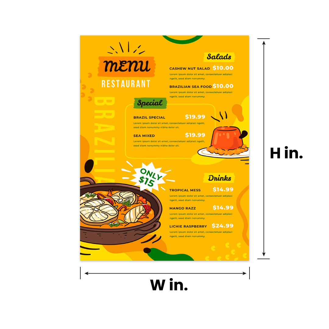 • Present Your Offerings in Style with Custom Menu Cards Make a lasting impression with beautifully printed menu cards that elevate your brand and enhance the dining experience. Whether you're designing for a restaurant, café, event, or pop-up, these cards offer a wide range of sizes, finishes, and materials to suit your aesthetic. Add your logo, dish descriptions, or promotional highlights and choose from foil stamping, embossing, or full-color printing to match your brand’s personality. With flexible sizing and premium paper options, these menu cards are as functional as they are eye-catching.