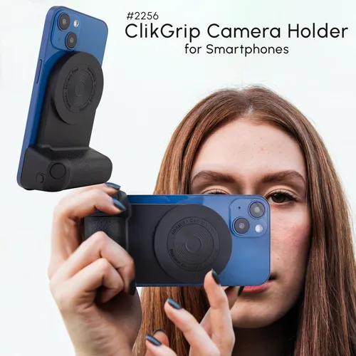 A camera grip-inspired design that brings comfort and stability to video and photo capturing. Simulate the feel of a camera grip with the ClikGrip phone holder. Magnetically attach to newer smartphones with MagSafe tech. Comfortably capture precious moments with the wireless-enabled shutter button. Plug in the ClikGrip and charge compatible wireless charging phones. It's a convenient phone stand for the office, at home, or while traveling for business.