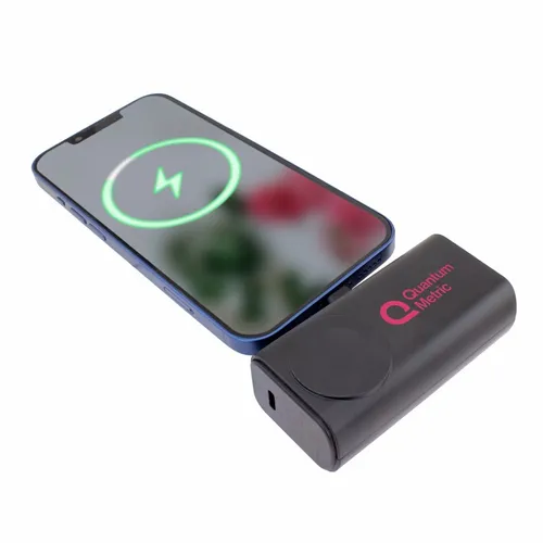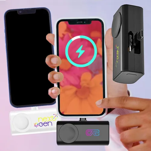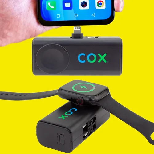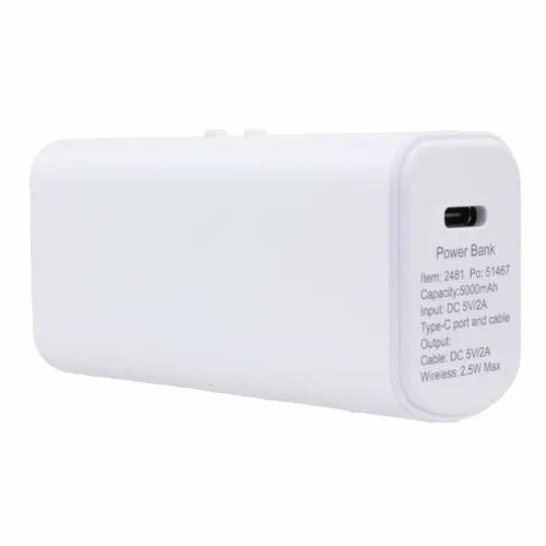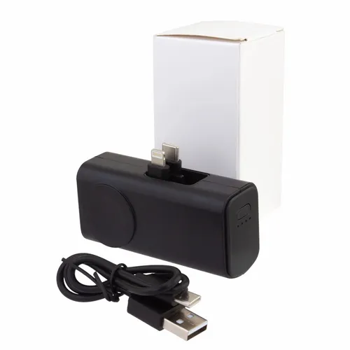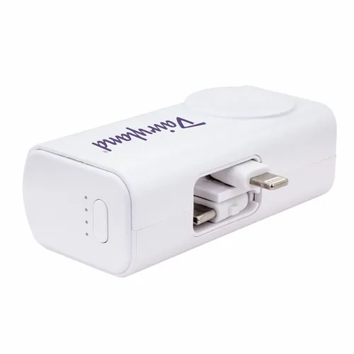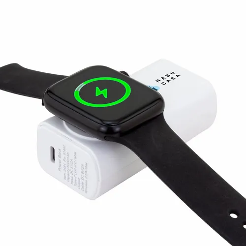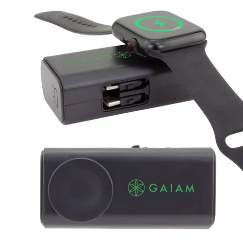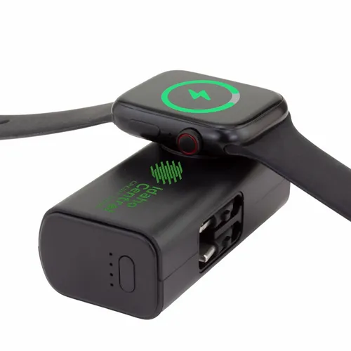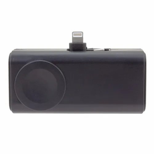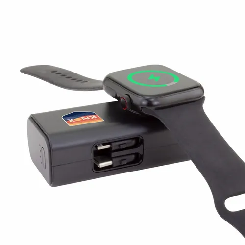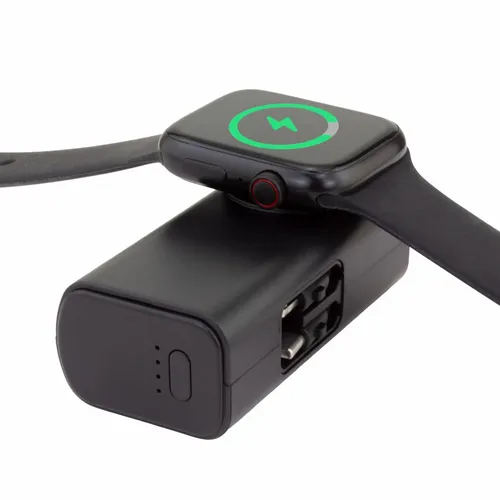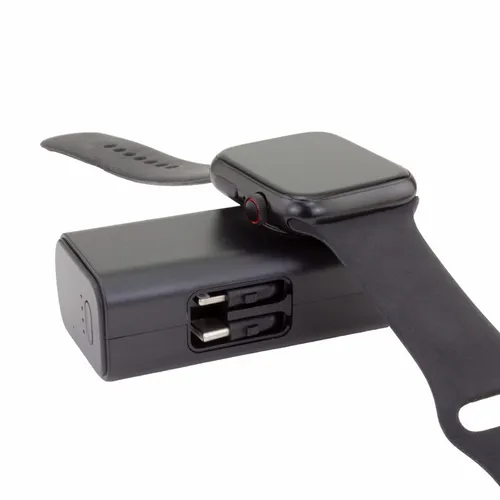 5,000 mAh battery capacity dual charging power bank with Lightning, Type-C plugs, and watch charger.